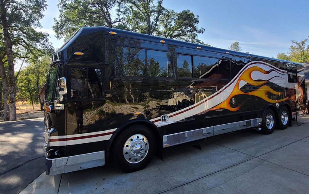 A year-long process had the bus in fresh black basecoat with better than new aluminum and steel bodywork. Al and his son Scott also fabricated a panel to utilize Corvette Z06 tail lights and license plate panel, a nod to Al’s love of Corvettes.