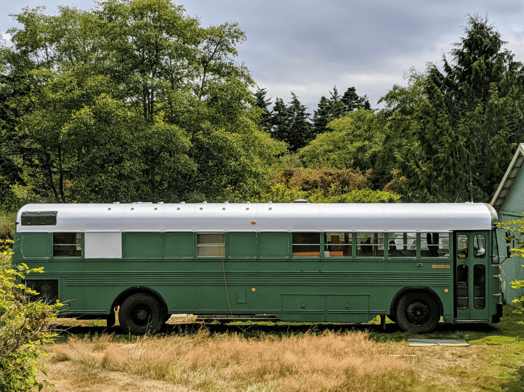 We painted our Skoolie with Behr House Paint five years ago. We used rollers and paintbrushes. We used two gallons for everything but the roof, which is painted with Henry's Tropi-Cool. The roof took two gallons the first time and another two gallons for a touchup a few years later.