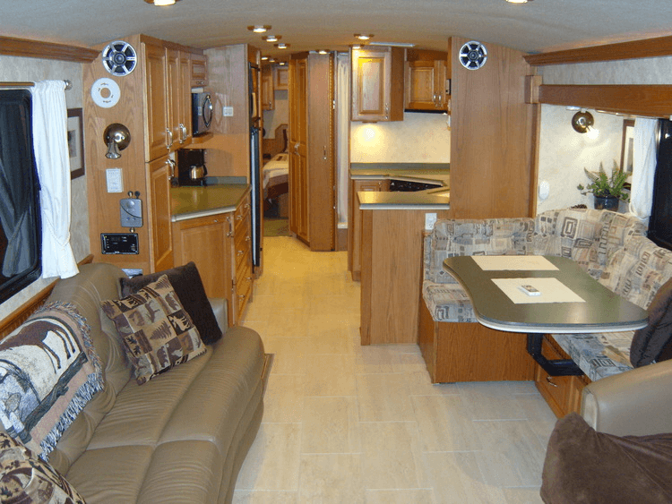 Our current RV has a semi-center aisle, and my wife doesn’t care for it much because the refrigerator is not forward facing.  It is easy to raise the roof on the Eagle buses, so you will see a lot of side isles in the Eagle coaches.  The inside height dictates the type of isle; in the older buses, you may need a side-isle unless both are short people.