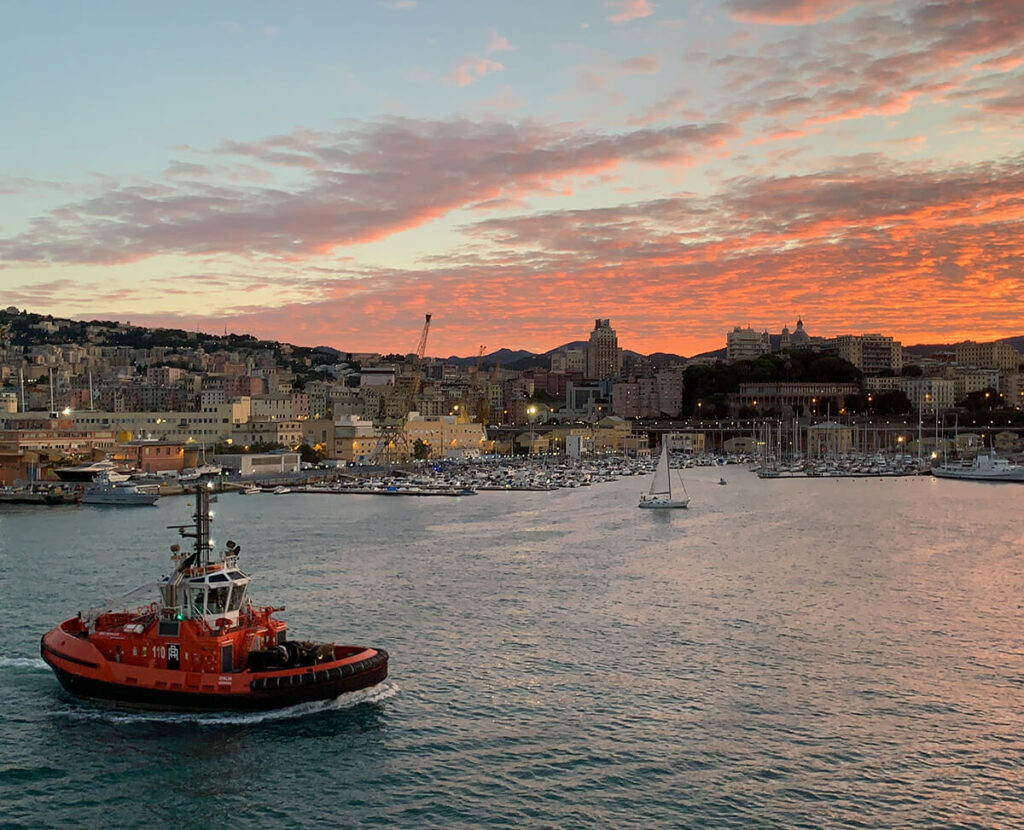 Frightened, I say to Thomas, “You shouldn’t feel relaxed, we’re not on the ferry yet.” At about 2:00 AM the last of the vehicles were loaded. After 57 hours on the ferry and a stopover in Barcelona, we arrived in Genoa at 8:30 in the morning.