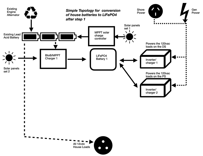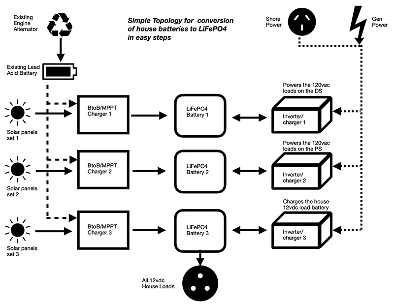 When you do decide to replace all but one of your existing lead acid batteries, just add another Li battery bank, another inverter/charger (or just a charger), another MPPT solar controller, and solar panels. Connect your 12vdc house loads to this new Li battery and your conversion is complete.