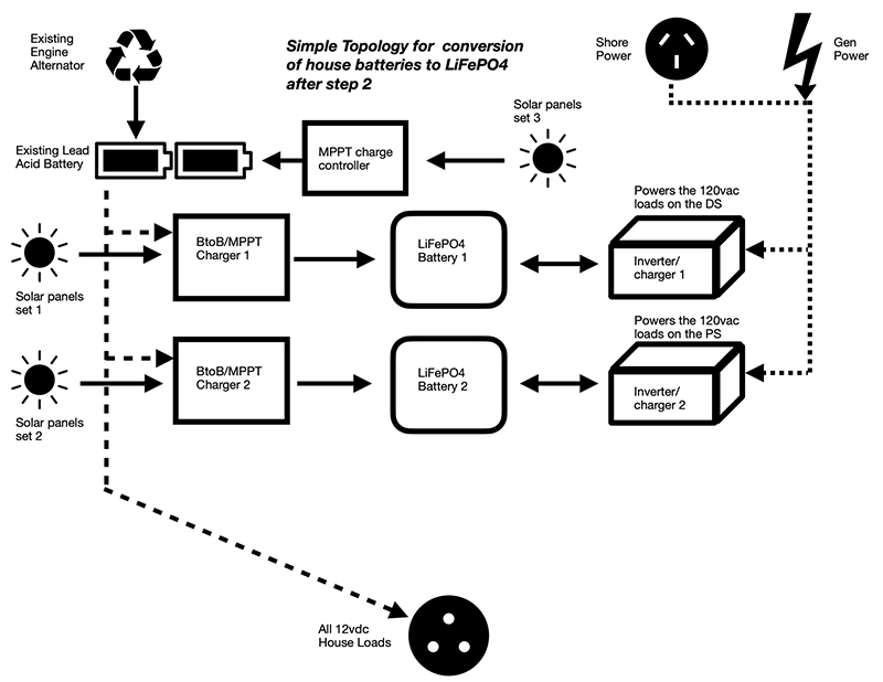 This topology is not only simple, easy, and safe to implement, but it is also very extensible over time. If you find you need more 120vac power the way you live in your coach, you can simply add a second Li house battery bank, a second inverter/charger, a second Batter-to-Battery charger, and a second MPPT solar controller and solar panels.