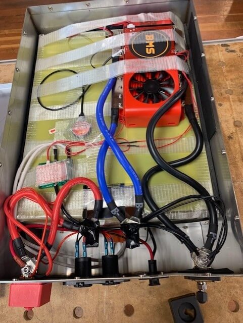 The screws that hold the top in place are stainless-steel machine screws going into threaded inserts, not sheet metal screws, so there are no sharp edges on the inside of the case either. The cells are properly separated with fiberglass separator sheets and the cells are connected with busbars. The whole battery pack is wrapped with fiberglass insulating sheets and it sits on top of a custom-made heating pad that covers the whole bottom of the pack.