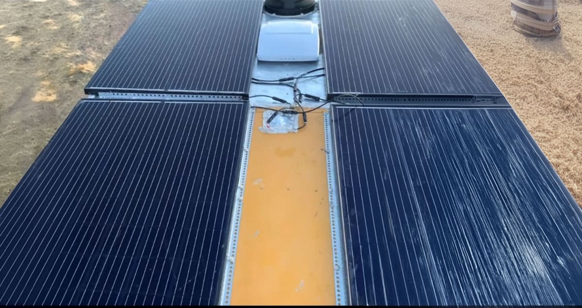 One thing you can do to maximize your energy usage with solar is to clean your solar panels often. To make this easier, we install a sprinkler system on the roofs of our buses. We use a quick connect on a faucet to plug a water hose into, and then you can rinse the panels with water from the onboard water system as needed to keep them operating at maximum capacity.