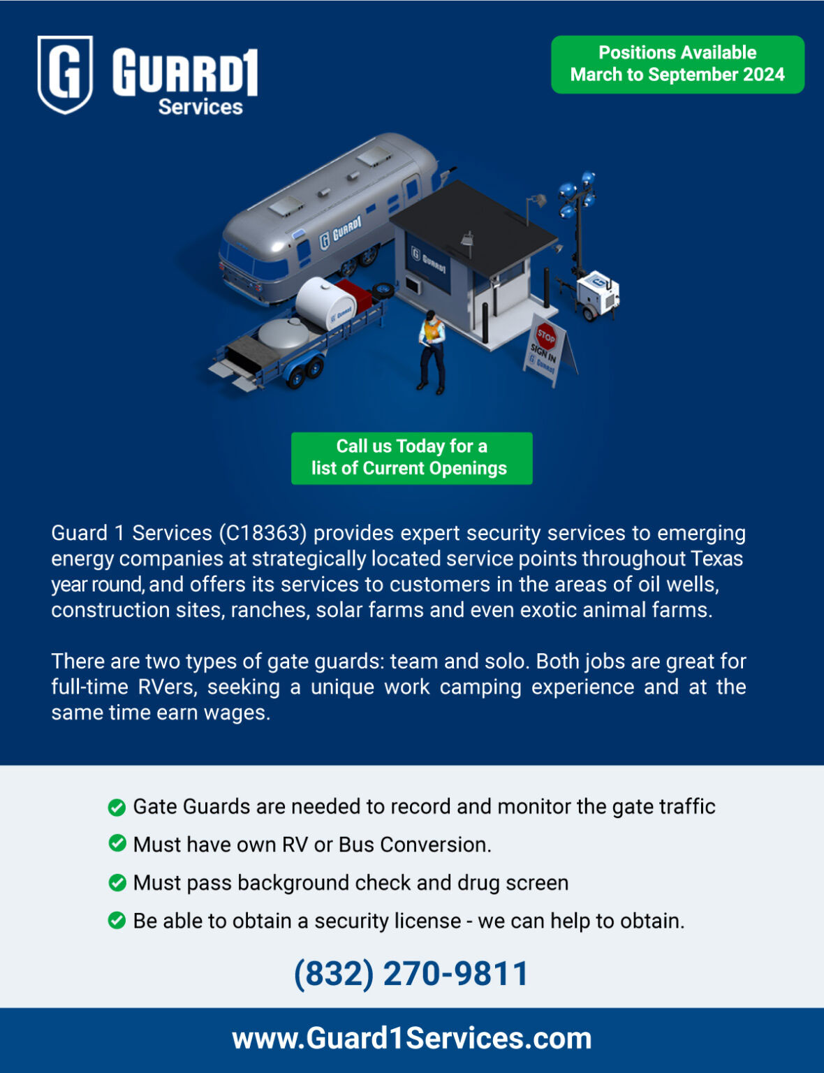 They not only need Guards for summer, but they need people throughout the year as the oil field operations go on year-round. We just choose to work in the summers, as we like spending our winters in Quartzsite, AZ, with friends, but you can choose to work any month you like.  Summer jobs in Texas are the easiest to obtain as many people travel north to cooler climates. Some snowbirds can work these jobs too.