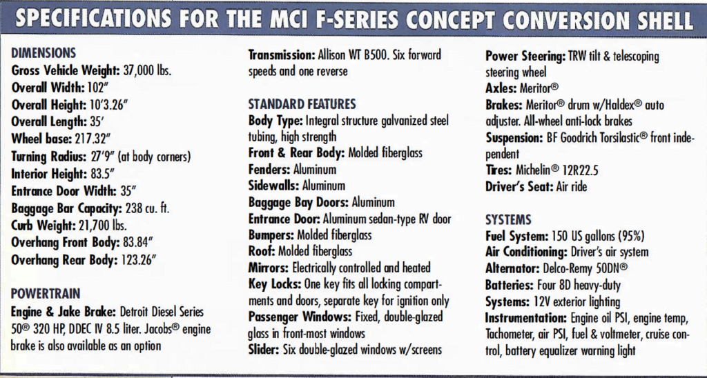 Converters and owners of the new MCI F-Series can expect support through the existing MCI International Club, motorhome organizations, as well as through several Hausman Bus Sales and Service Centers, which are located around the U.S. and Canada. Delivery of the FSeries is anticipated for mid-2000.