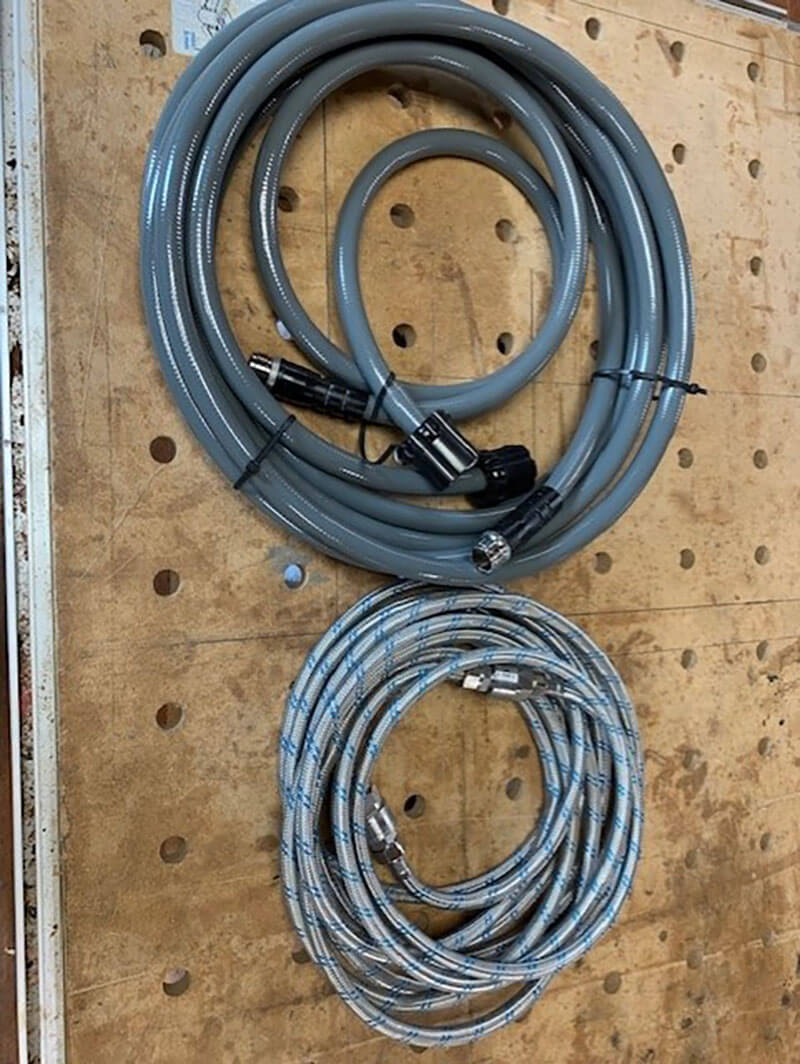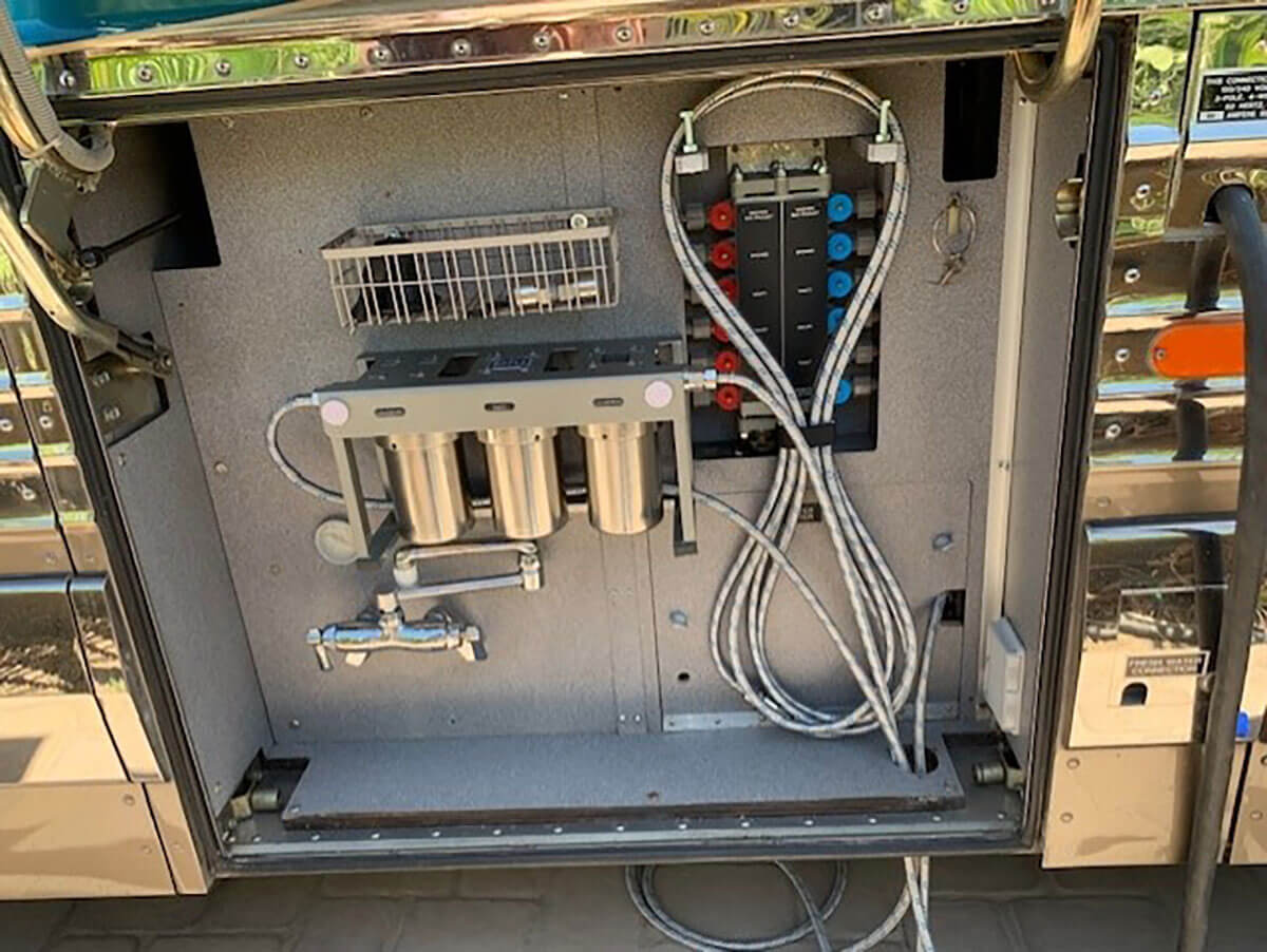 With the BluTec filter set mounted in the water bay, a 25-foot braided stainless-steel hose runs from the inlet side of the 3-stage water filter set down through a port in the floor and out to the pressure regulator screwed to the hose bib. If we are traveling where the water is soft enough not to require the water softener, a braided stainless-steel hose with quick disconnects runs from the outlet side of the 3-stage filter set through a water meter (so I can keep track of how much water has passed through the filters) and then connects directly to the plumbing lines in my coach.