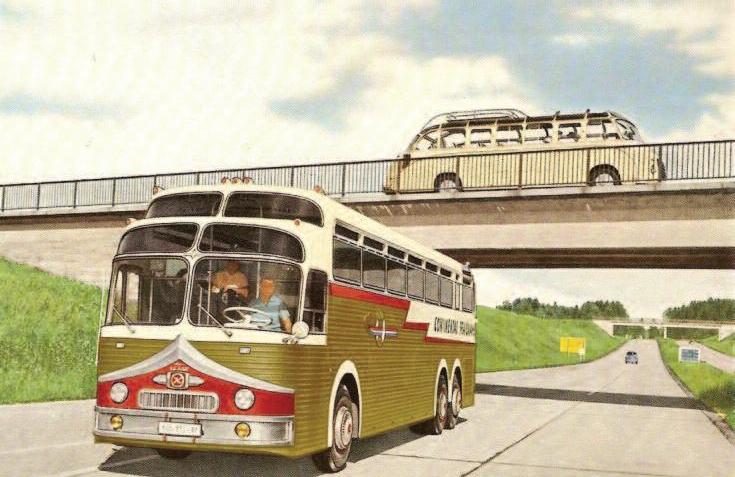 This is from a posed photo taken during the Kässbohrer autobahn testing of the first Eagle in Germany. It was soon named the “Golden Eagle” because of the gold-colored aluminum siding and the Eagle logo of American Bus Lines, a predecessor to Continental Trailways.