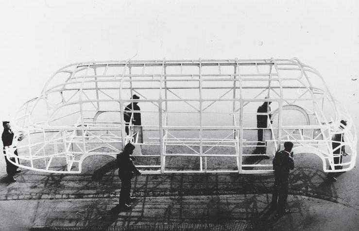 Kässbohrer in Ulm, Germany developed integral construction in 1951 that they called “selbsttra-gend” or “self-supporting.” It was originally used in their short S-8 model and started their Setra line. This historic photo has six Kässbohrer staff members holding the frame structure to show its light weight.