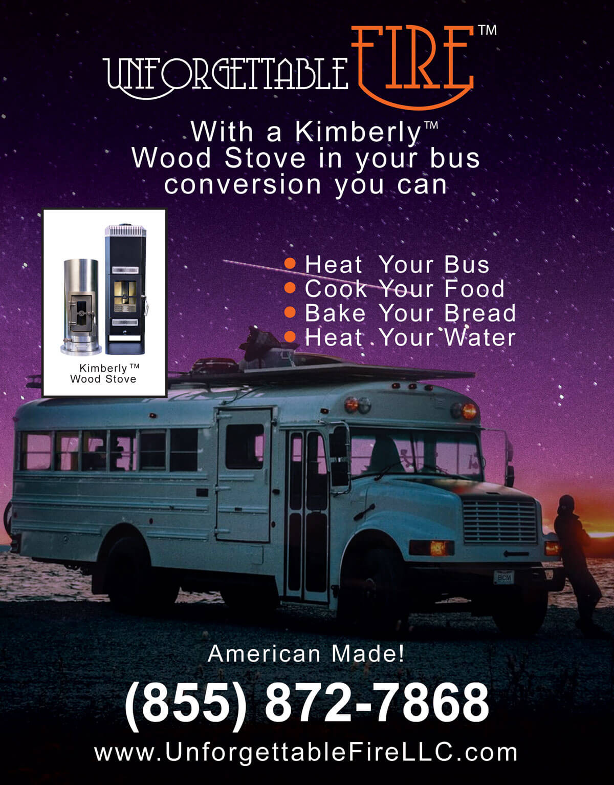 Inventor Roger Lehet, is the founder, owner, and Chief Executive Pyromaniac of Unforgettable Fire™. Developed out of necessity for his own family, Roger's little Kimberly™ wood stoves now heat buses, boats and vans and tiny homes. Roger is currently focused on creating sustainable energy solutions to empower all Americans to survive and thrive, while at the same time being gentle to the environment.