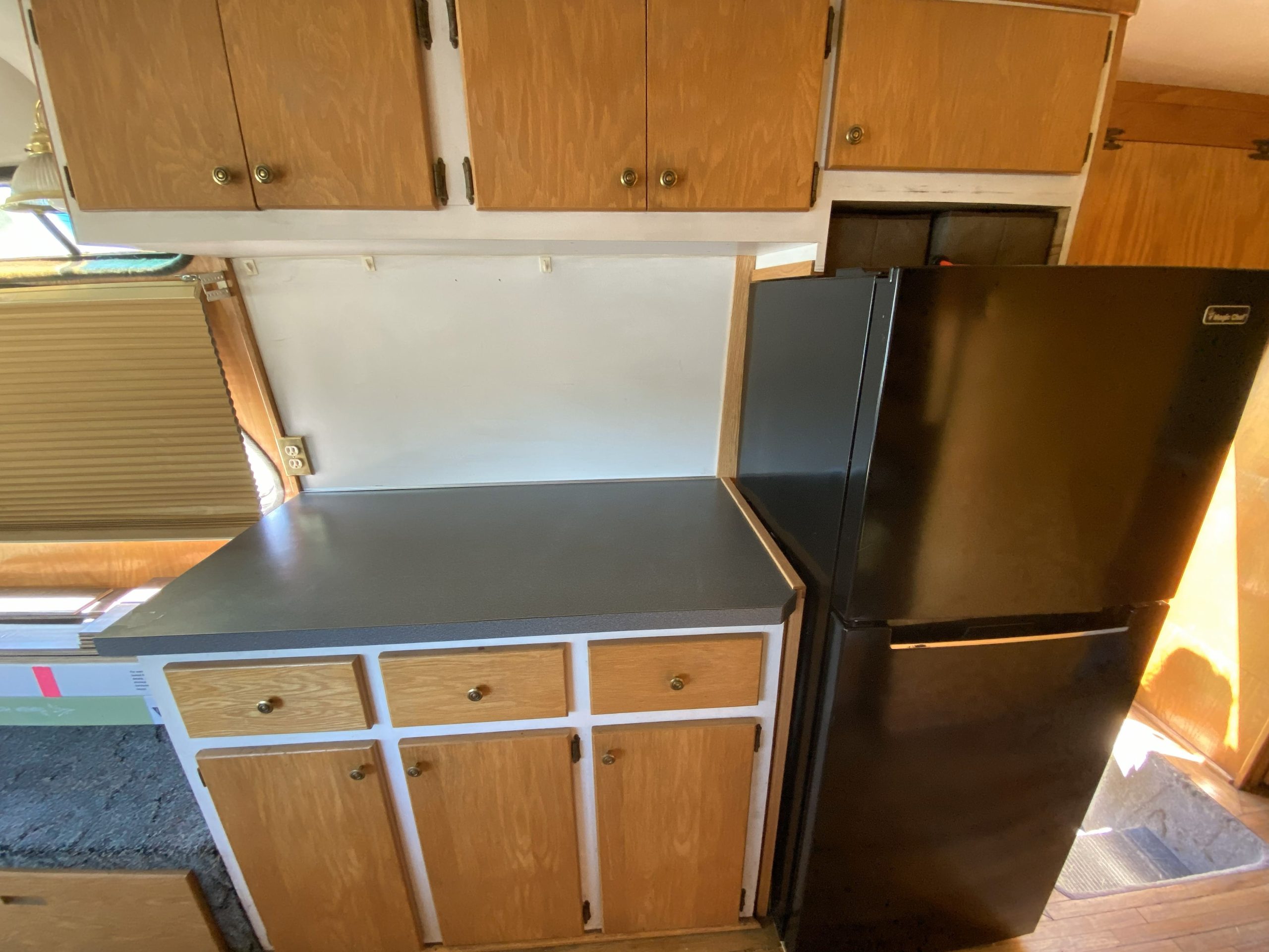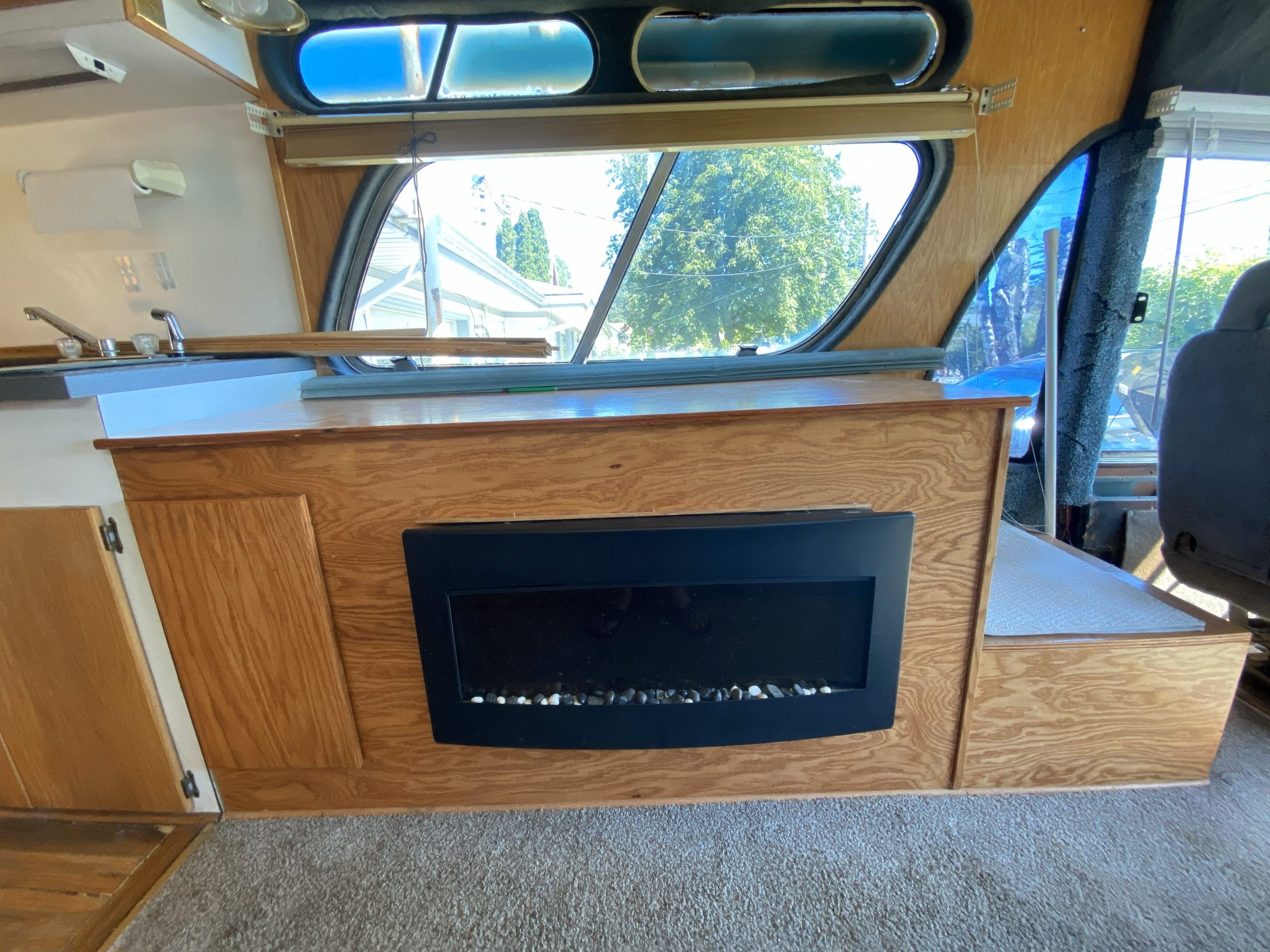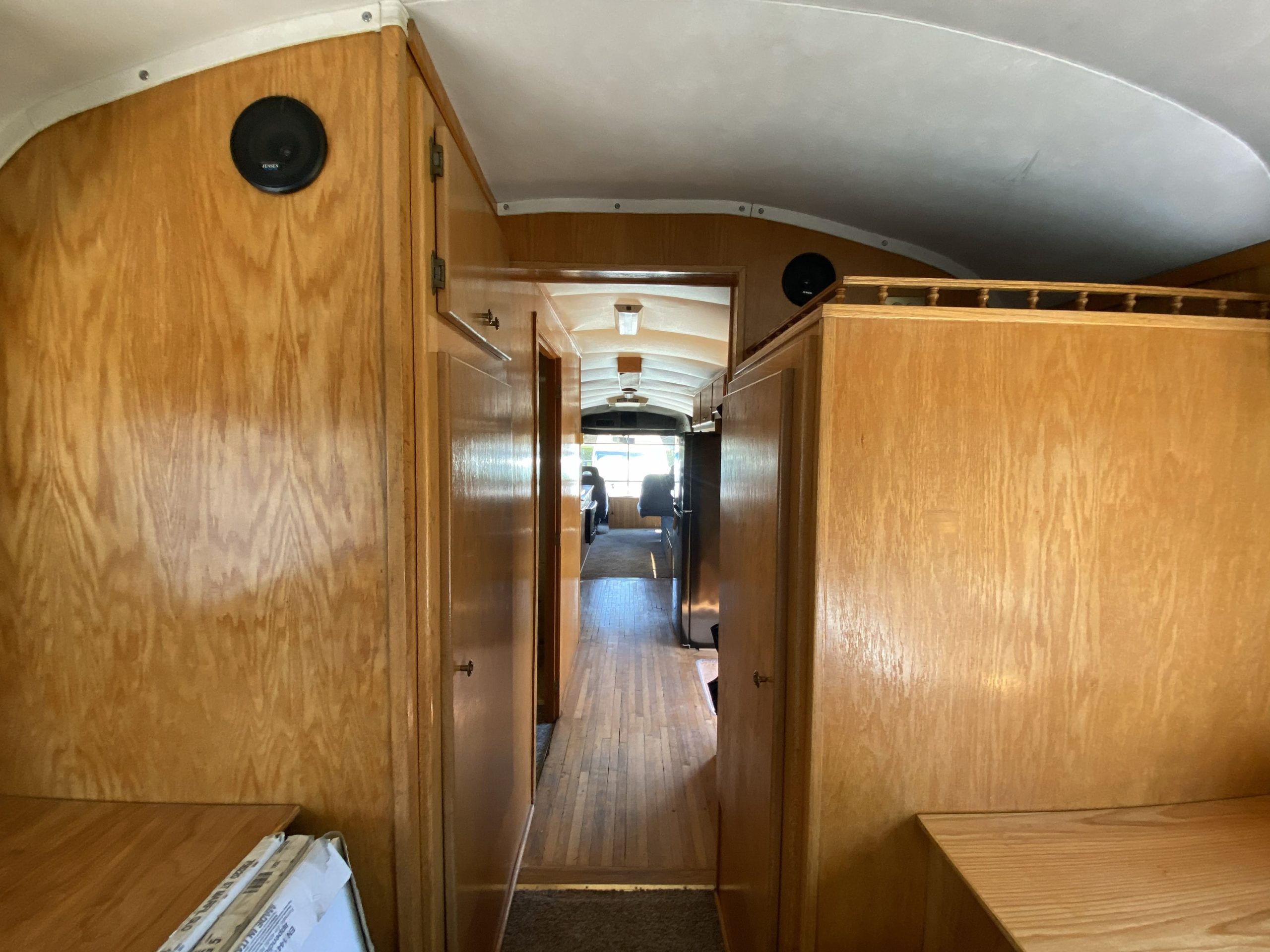 Inside it's built out like an RV with a full bedroom, bathroom, kitchen, and living room. There is tons of storage space. NOTE: Bathroom is currently mostly gutted (vanity still intact). Old flooring and carpet have been ripped up. Old wallpaper, wood wall laminate, and some of the “rat fur” lining removed.