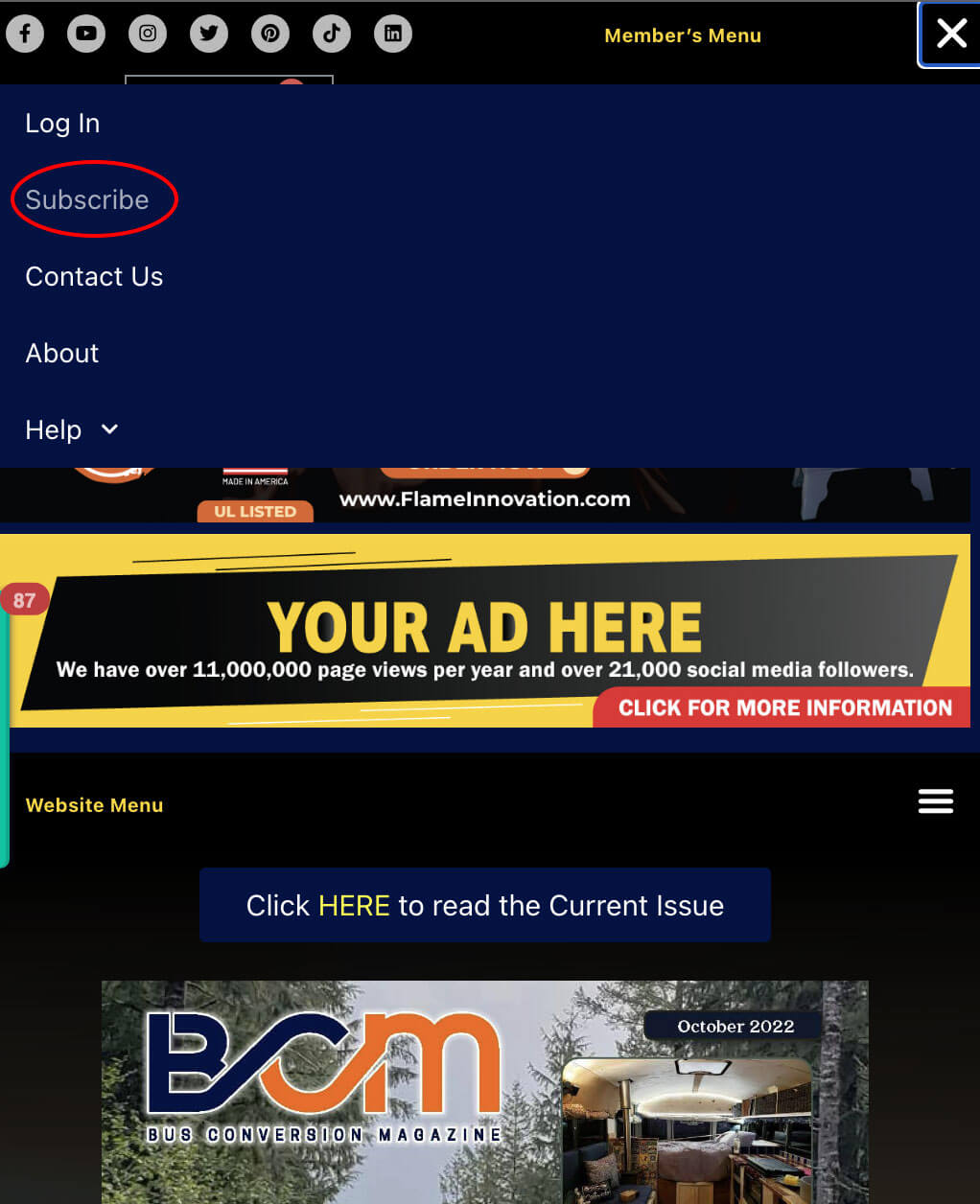 If you are using a mobile device or tablet, choose the “Member’s Menu” in the upper right-hand corner of your screen. A window should pop up and you can choose “Subscribe”.